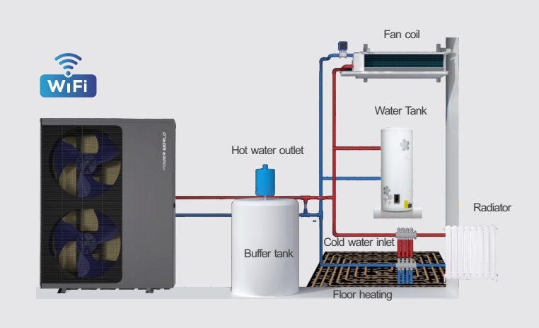 Dank der Full-DC-Wechselrichtertechnologie kann das System die Betriebsfrequenz intelligent anpassen und die Wassertemperatur steuern, um den Innenraum auf einer konstanten Temperatur zu halten. Außerdem kann es bis zu 50% Energie im Vergleich zu ON-OFF-Geräten und bis zu 75% Energie im Vergleich zu herkömmlichen elektrischen Boiler-Wärmepumpen einsparen.